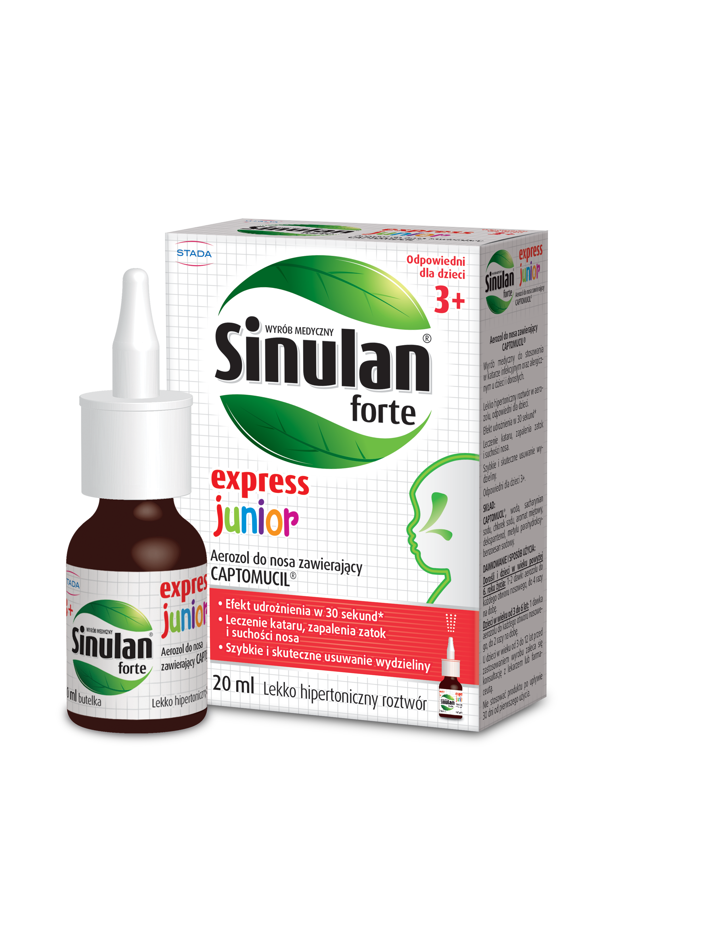 Sinulan Express Forte Junior wyrób medyczny w postaci aerozol do nosa zawiera opatentowany CAPTOMUCIL®. Jako roztwór izotoniczny, stosowany jest wspomagająco w stanach zapalnych, takich jak zapalenie błony śluzowej nosa, zapalenie zatok oraz w przypadku kataru lub suchości nosa. Szybko i skutecznie usuwa wydzielinę, udrożniając nos.